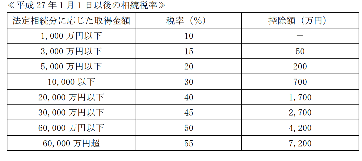 上記例の課税相続税額2,600万円であれば、税率15%-控除額50万円が該当します。