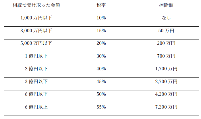 それぞれが受け取った遺産額に応じた税率をかけて計算をします。法定相続分の割合と相続税の一覧表は以下の通りです。